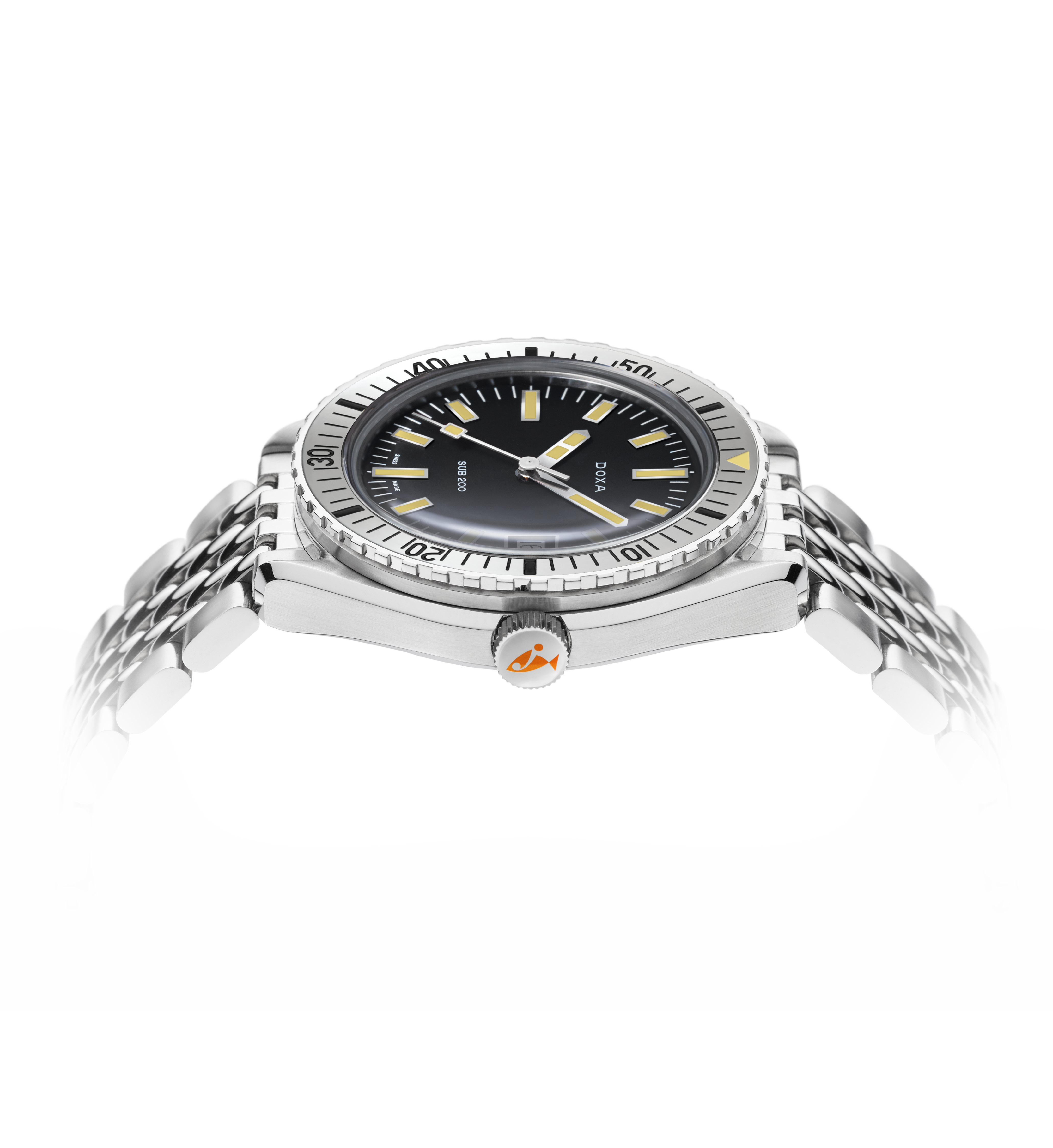 Denna 3-hands dykarklocka presenterades på Baselworld 2019 och har en boett tillverkad av 316L rostfritt stål av högsta kvalitet. SUB 200 har en diameter på 42 mm med ett reptåligt safirglas med antireflexbehandling och den distinkta böjningen hos det välvda plexiglas som användes förr i tiden. Modellen är vattentät ned till 200 meters djup (20 ATM) och har en enkelriktad roterande boett. Alla element som ger dykrelevant information, inklusive ramen, har en Super-LumiNova® självlysande beläggning. Armbandet är tillverkat i 316L rostfritt stål och har ett vikbart lås med DOXA-fisksymbolen.