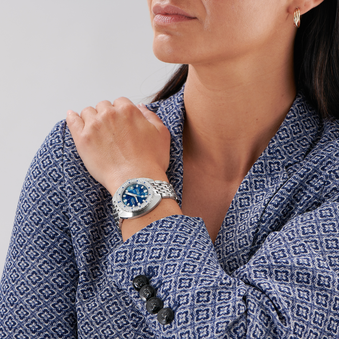 Klockan är designad med en raffinerad boett på 39 mm och en tjocklek på 10,70 mm för komfort, och har en konstruktion i 316L rostfritt stål, schweiziskt automatiskt urverk, 38 timmars gångreserv och element som datumfönster, enkelriktad roterande boett och skruvbar krona. Den är vattentålig till 200 meter, har ett reptåligt safirglas och Super-LumiNova®-beläggning för optimal läsbarhet. Den förbättrade urtavlan med applicerade timmarkörer ger en touch av sofistikering, som framhävs av pärlemorskivans glitter.