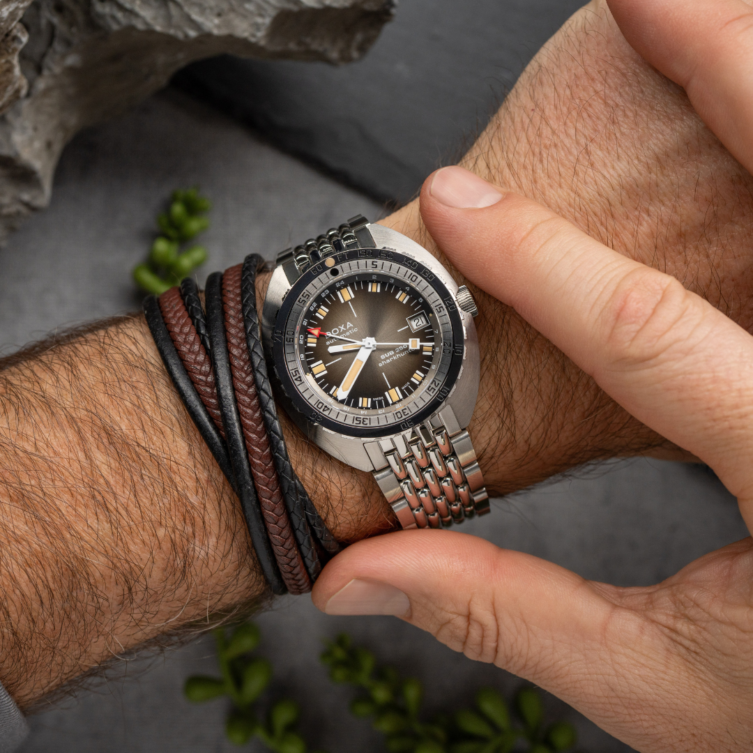 SUB 250T GMT markerar DOXAs återkomst till GMT-funktionen och kombinerar robustheten hos en dykarklocka med världsklockans funktionalitet. Klockans 40 mm boett i rostfritt stål ger en perfekt balans mellan närvaro på handleden och komfort. Den skruvade kronan och den envägsroterande bezeln med dykarskala garanterar prestanda på professionell nivå. Med en vattentäthet på 250 meter (820 fot) är klockan designad för både undervattensäventyr och resor mellan tidszoner.
