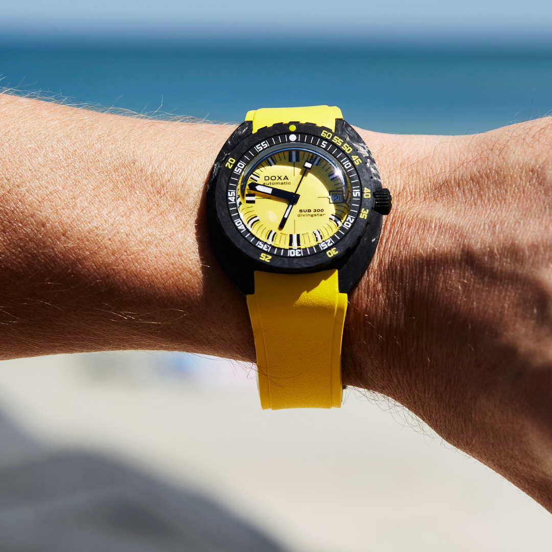 SUB 300 i kolfiber finns i 7 färger med möjlighet att välja mellan ett gummiband i svart eller i samma färg som urtavlan. Remmen har distinkta DOXA-detaljer på båda sidor och är försedd med ett svart PVD-behandlat viklås som är dekorerat med den exklusiva DOXA-fisksymbolen. Det har också en justerbar dykförlängning för att passa tjockleken på en våtdräkt.
